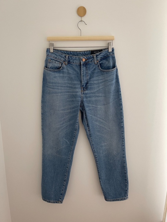 Jeansowe spodnie. Krój z krótką nogawką, tapered leg. 2gie zdjęcie produktowe oddaje jak się ukłają na sylwetce.