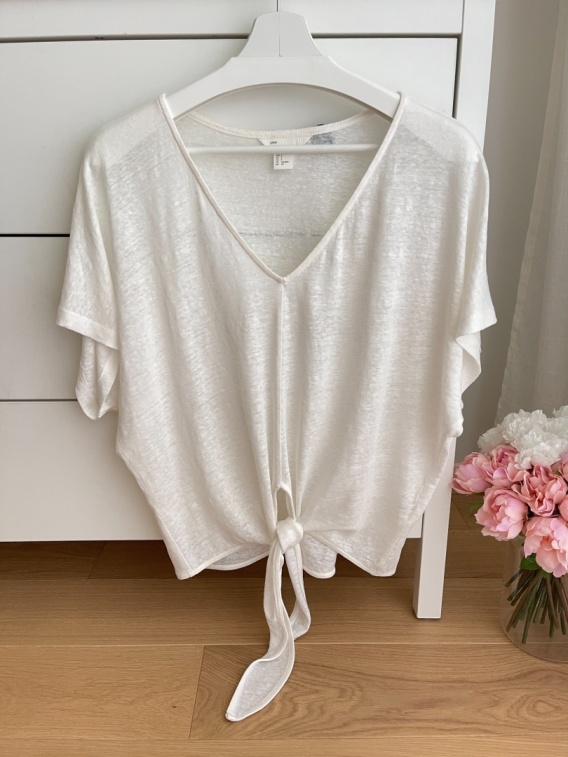 Lniany t-shirt z wiązaniem. Posiada luźny krój i obniżoną linię ramion. Ciepły odcień bieli.