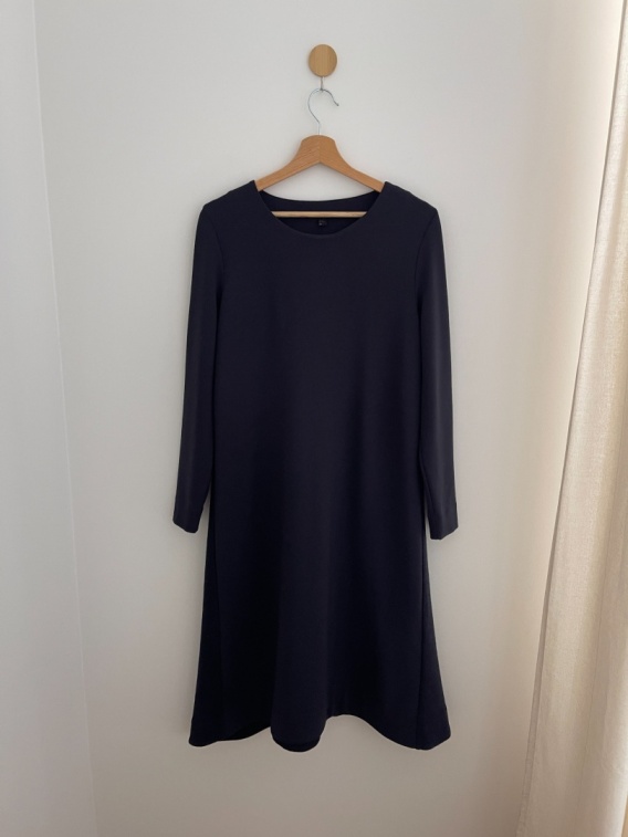 Granatowa sukienka COS roszerzana ku dołowi. Przód wykonany głównie z wiskozy, tył z przewagą wełny. Zdjęcia nie oddają jak ładnie układa się na sylwetce.